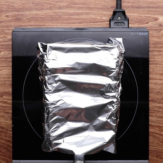 6.卵焼き器にサラダ油小さじ1を引いて弱火に熱し、生地を流し入れる。アルミホイルで蓋をして弱火で8分焼き、裏返してさらに3分ほど焼く。