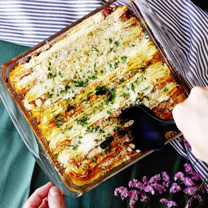 4. 耐熱の器に流し入れ、1を絞り出す。粉チーズを全体に振りかけ、230度のオーブンで15分、表面に焼き色がつくまで焼く。みじん切りにしたイタリアンパセリを散らす。⠀⠀