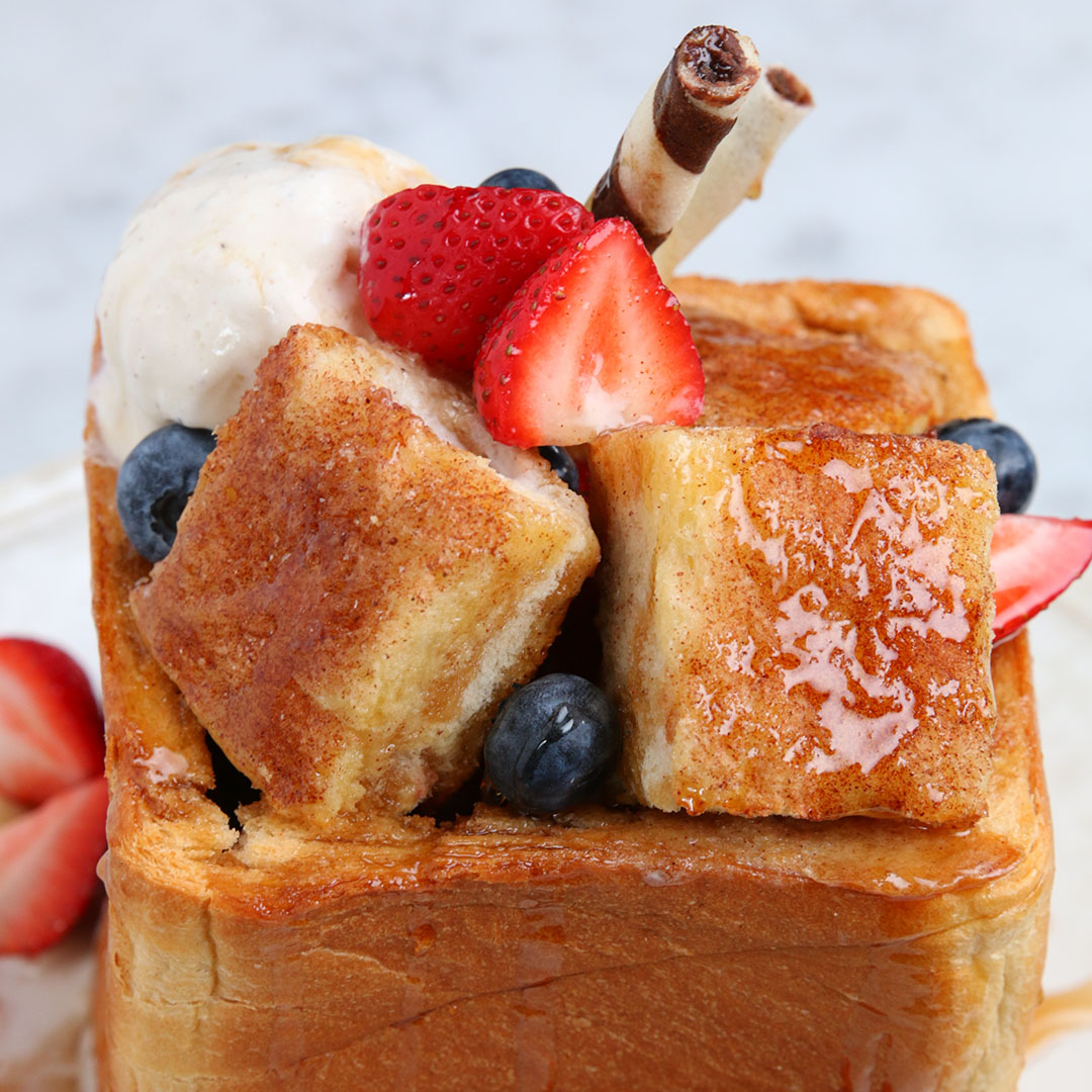 8.お好みでバニラアイス、イチゴ、ブルーベリー、クッキースティックなどをトッピングし、メープルシロップをかけたら、完成!