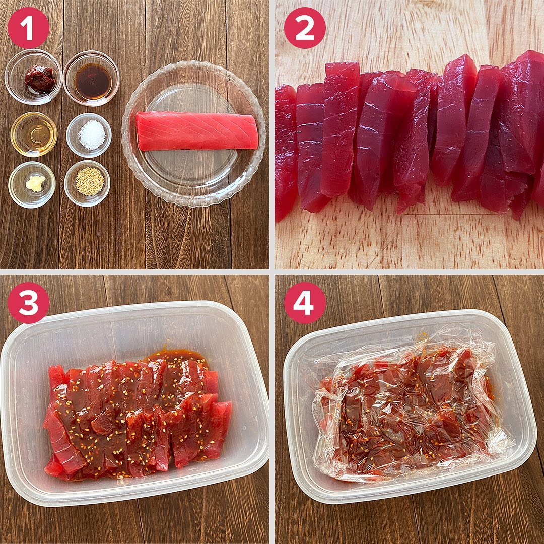 保存容器にコチュジャン、しょうゆ各小2、砂糖、ごま油、白いりごま各小1、おろしにんにく少々を入れて混ぜ、まぐろを入れて和え、ラップをして冷蔵庫で15分漬ける。
