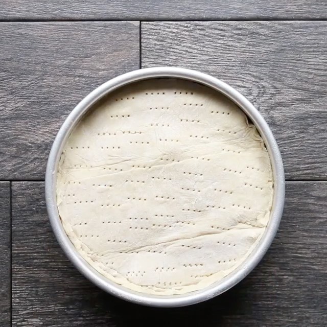 2. パイシートをケーキ型の底の大きさに合わせて丸く切り、フォークを使って全体に穴を開ける。
