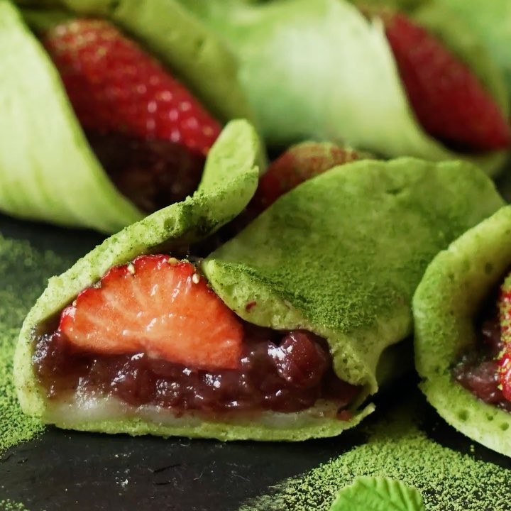 【もちを切るのが難しい】イチゴと抹茶のミニクレープ🍓⠀⠀