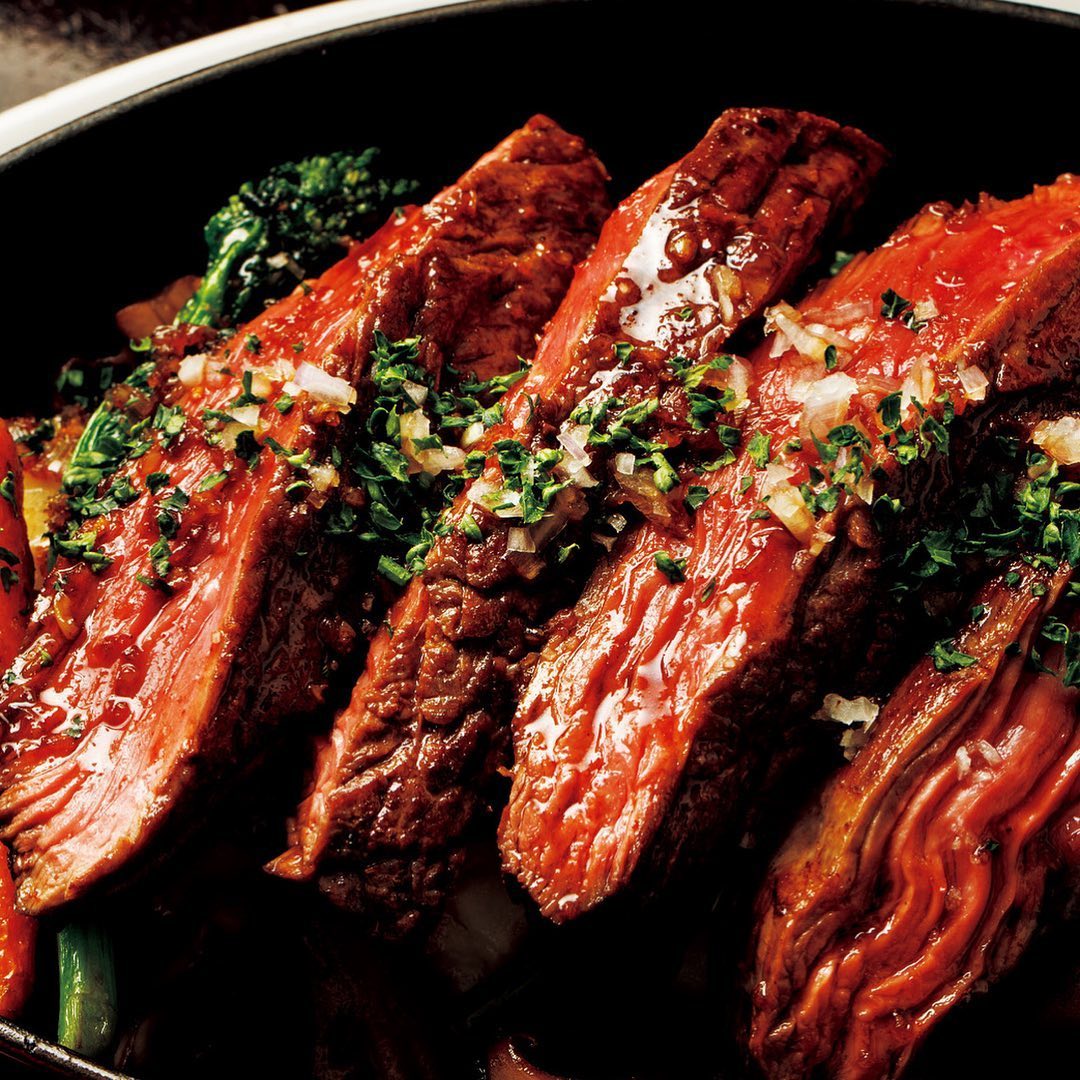 オーブンとフライパンを使い分け、火入れをした豪快なカイノミ。