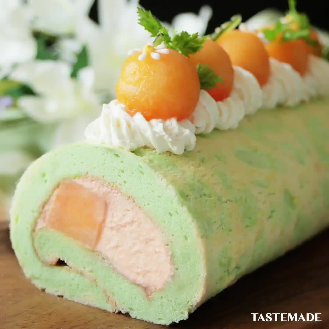 スポンジ生地をメロンに見立てたっぷり赤肉のメロンを入れたロールケーキを作りました✨