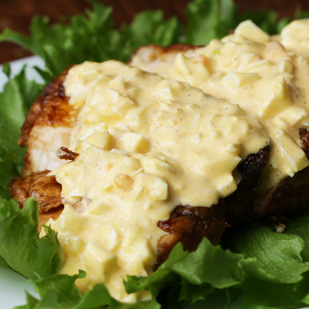 6.器にレタスを広げてチキンをのせ、タルタルソースをたっぷりとかける。仕上げにパセリを散らしたら、完成!⁣