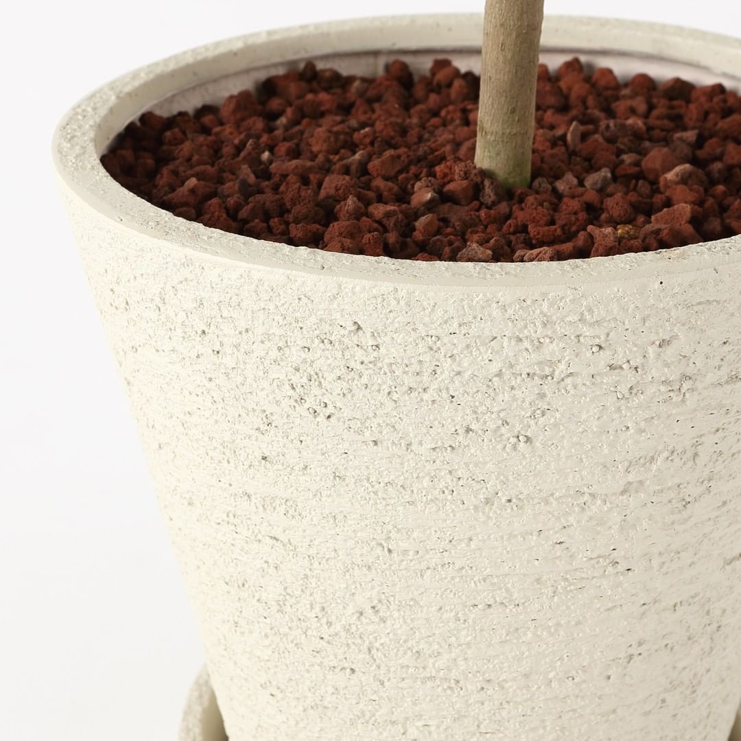 セメントのような雰囲気でありながら、軽さと耐久性にすぐれた、樹脂素材のプランターに、観葉植物を植えました。