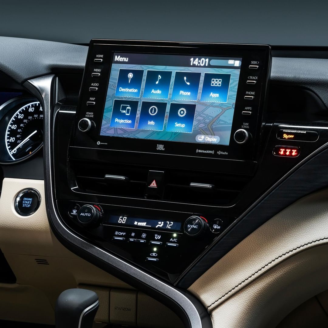 The 2021 #Camry XLE has a redesigned interior for an elevated ambience and optimized functionality! A new 9-inch central touch-screen display comes standard with available JBL Premium Audio and Dynamic Navigation. #LetsGoPlaces