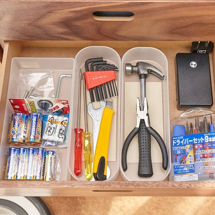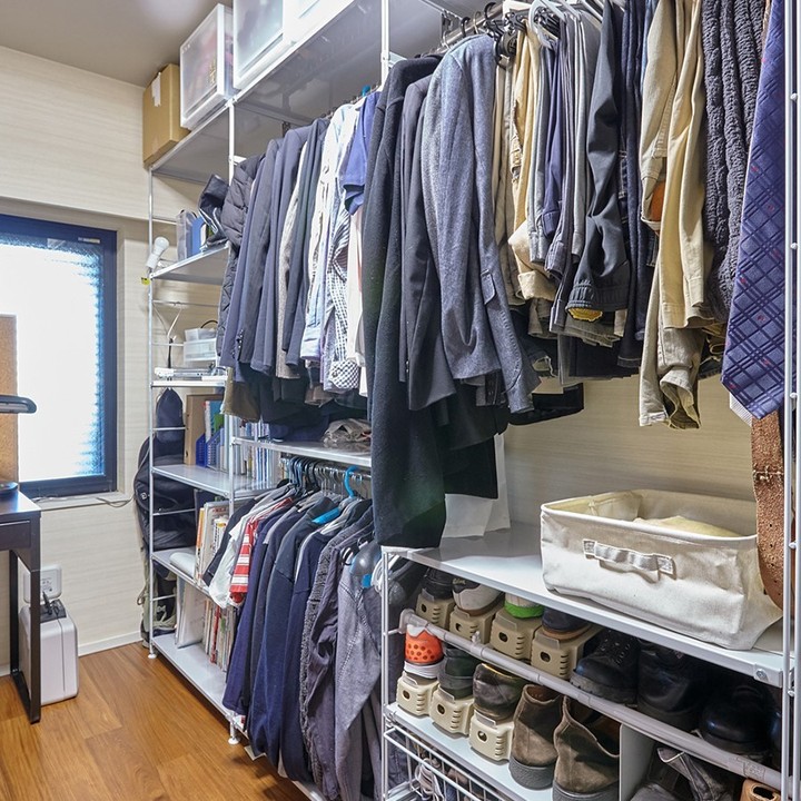 スタッキングシェルフを使用したリビングの壁面収納や、ユニットシェルフによるクローゼット収納など、汎用性のある家具で高い収納力を実現しています。