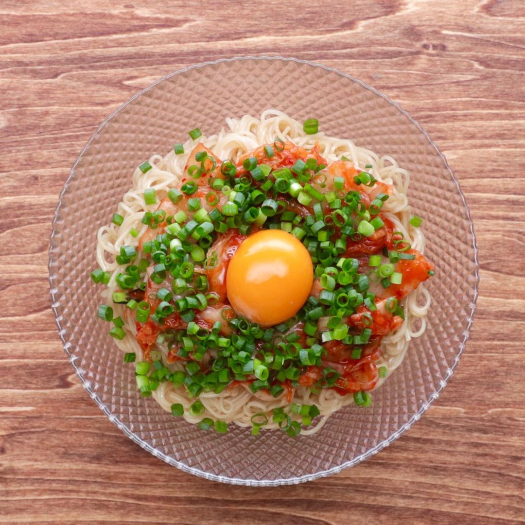 ボウルにごま油、焼肉のタレ各大さじ1、しょうゆ小さじ1、茹でたそうめん2束(100g)を入れてしっかり混ぜる。器に盛り、お好みで白菜キムチ、万能ねぎ、いりごま、卵黄をトッピングしたら、完成!