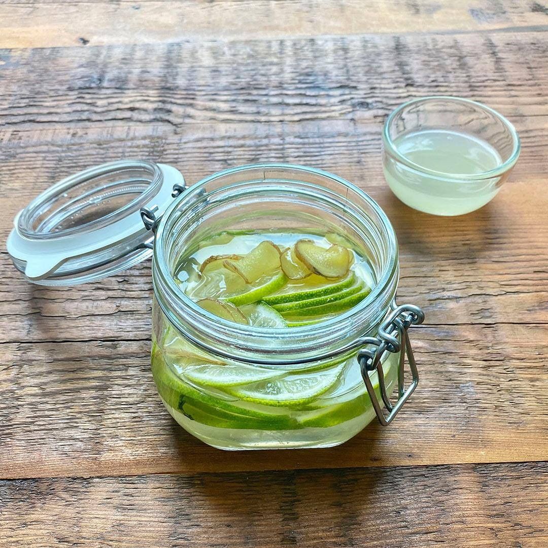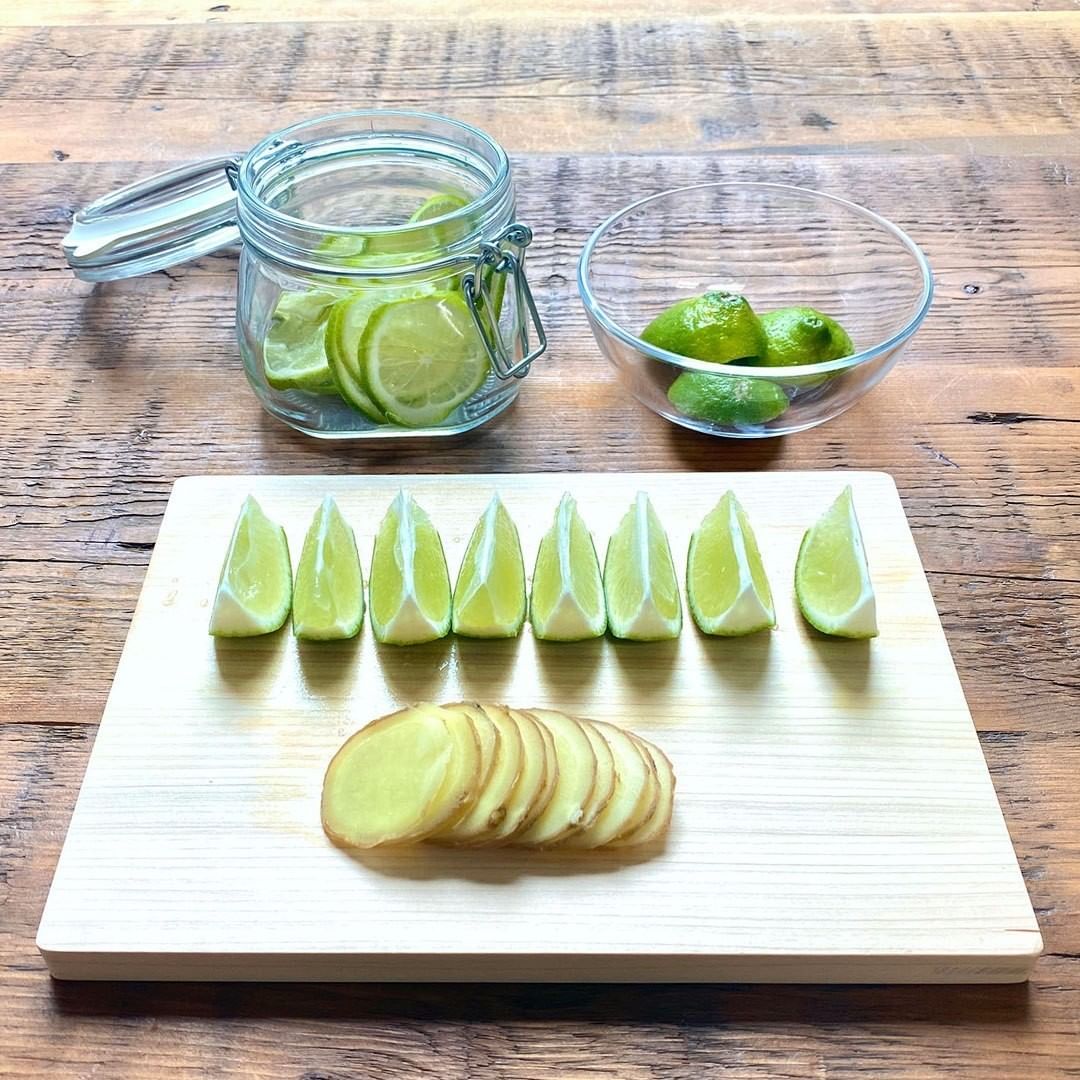 4.(3)から生姜以外を取り除き、(1)で輪切りにしたライムと合わせて保存容器に入れ、半日~一晩漬ける。