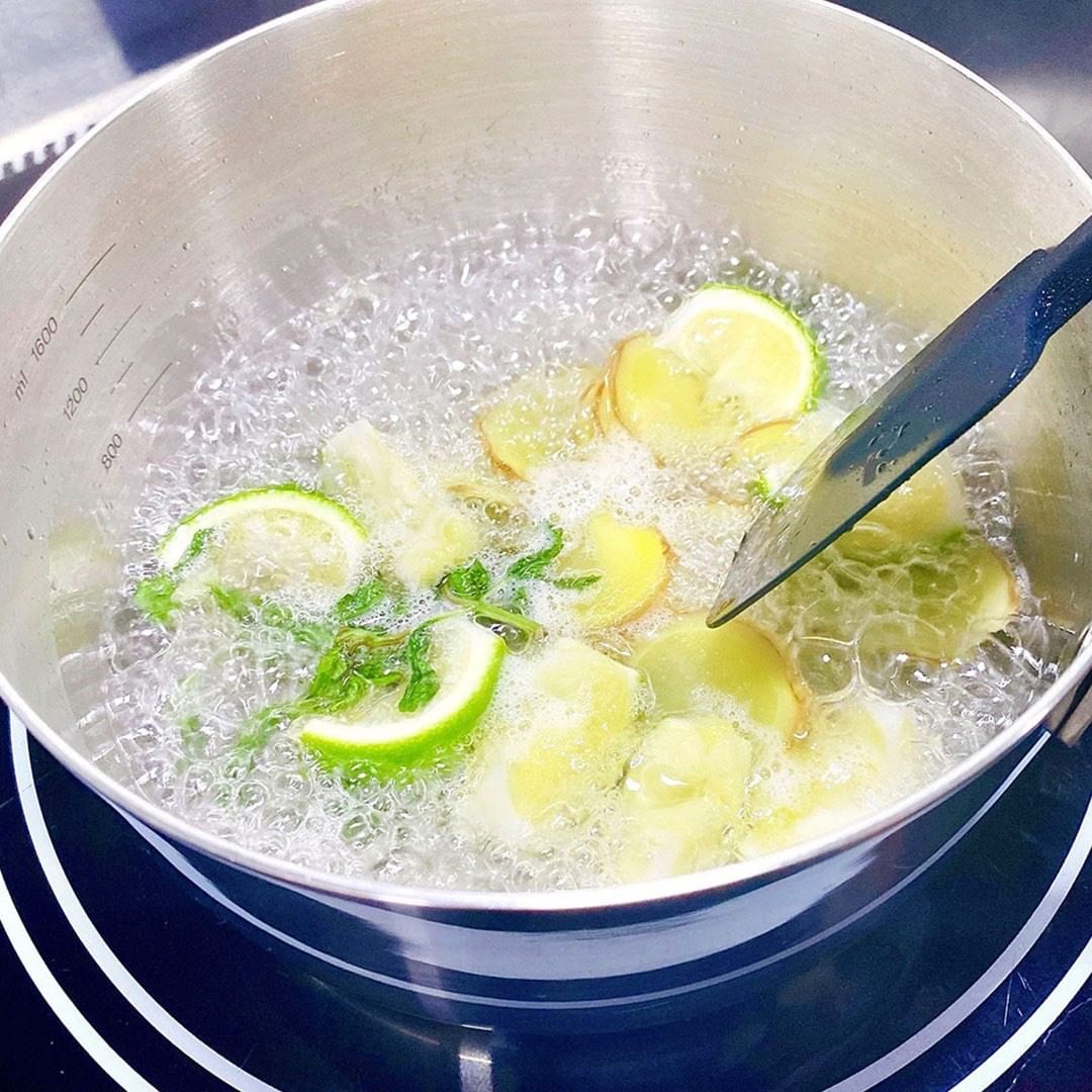 2. 鍋に(1)でとっておいたライムのヘタ、絞ったあとの皮に、ミント、生姜、グラニュー糖、水を入れ、ヘラで混ぜながら中火にかける。
