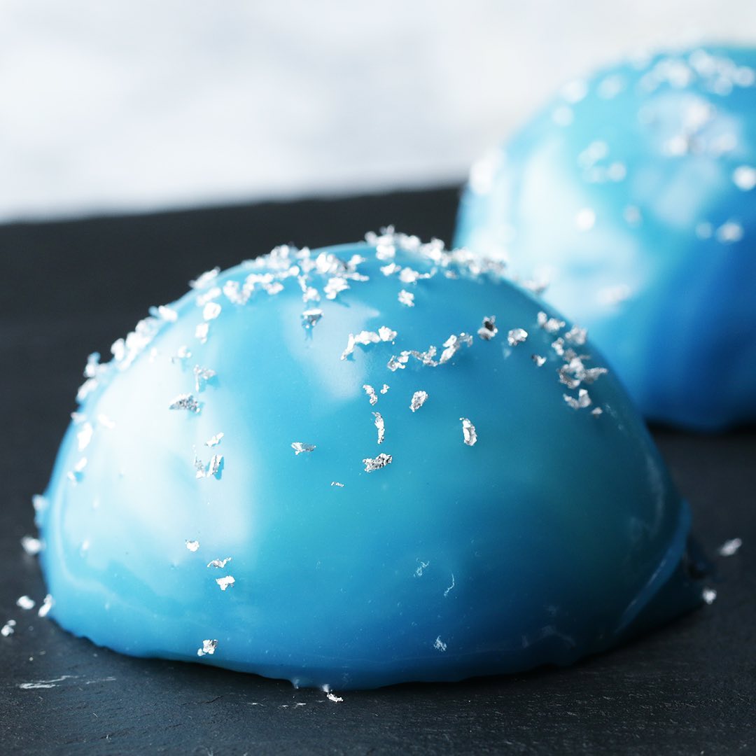 9.(4)のケーキに(8)をかける。仕上げに銀粉を散らしたら、完成!