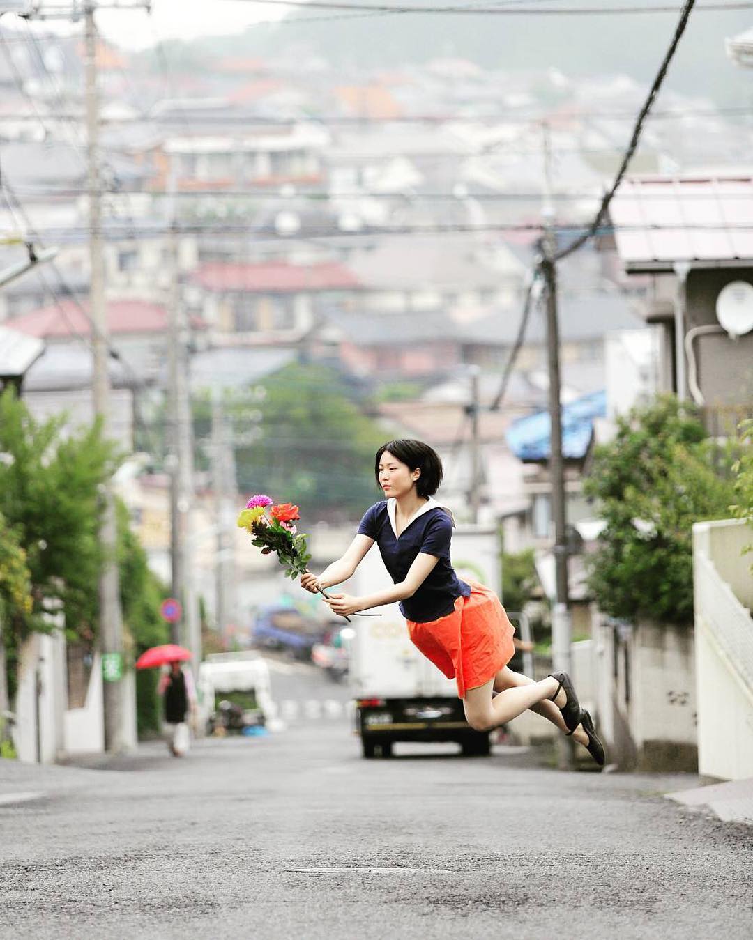 「林ナツミさんに憧れて、浮遊写真を撮りはじめました」のりか (@noricame2) さんのInstagramアカウントの書き出しはこんな言葉から始まる。作品には彼女自身が街の至るところで宙に浮きながら移動しているような姿が写り、まるでワイヤーに吊されたかのような脱力感と、人形のような無表情さに加え、独自に編み出したたくさんの工夫が詰まっている。「 “バッグを持って近所を散歩浮遊” など、小物を使ってストーリー性がでるように工夫しています。ストーリーの内容によってジャンプの仕方や手の表現も変えたりします。コツは、手を柔らかくみせるために力を抜いて、足を伸ばしなが飛ぶことです」