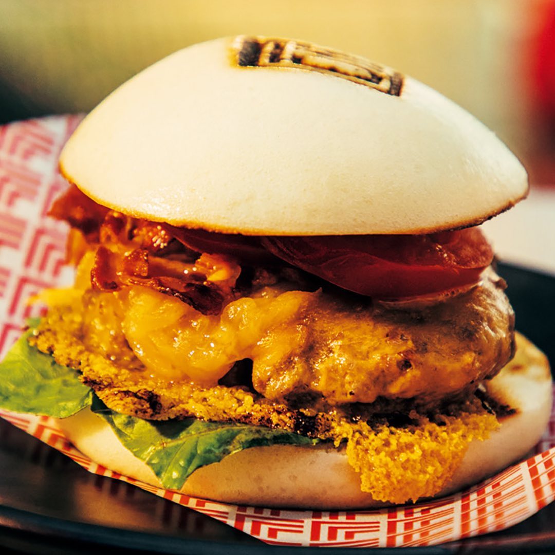 ①国産牛100%のジューシーなパティにBBQソースが効いた「BAO BURGER」¥1,300。