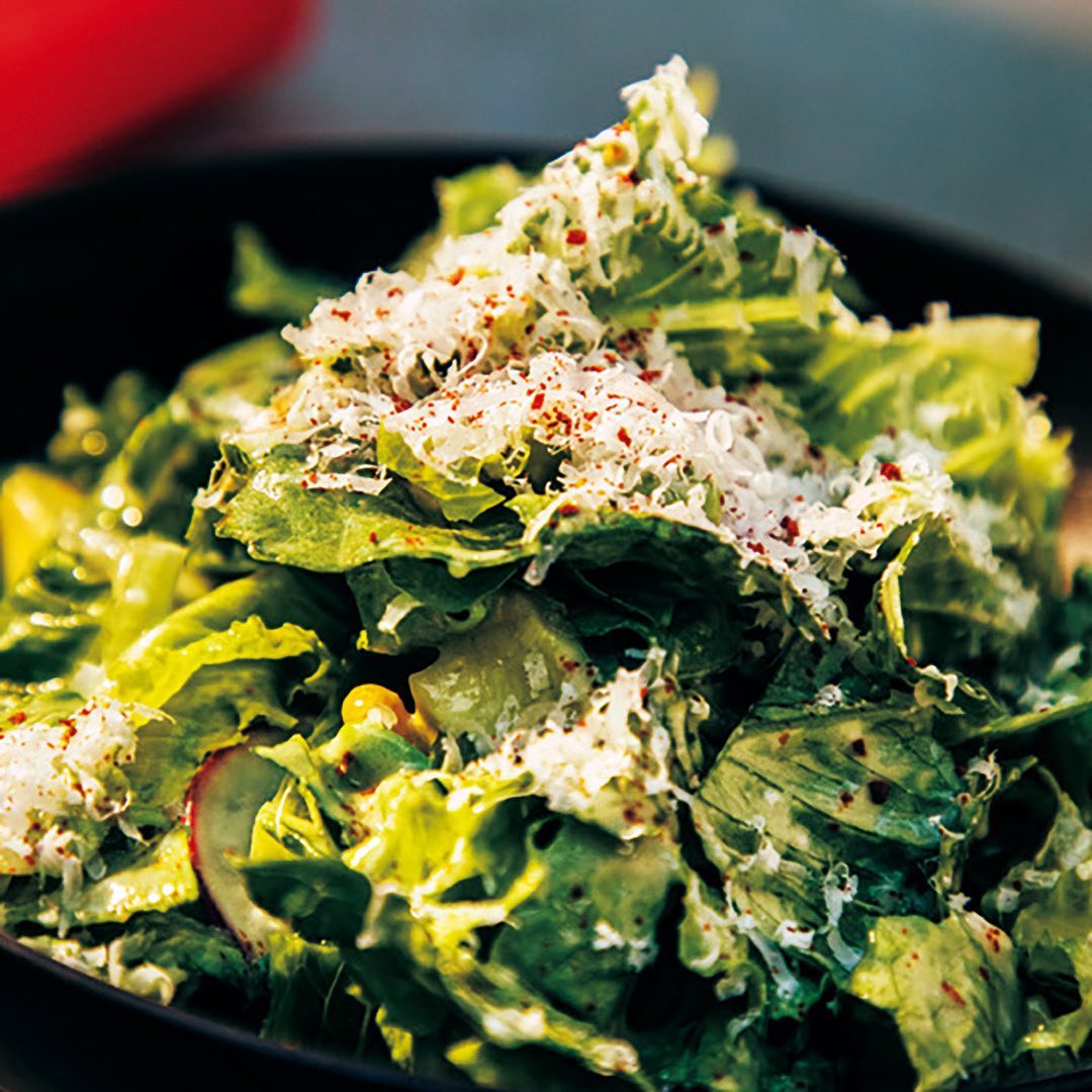 ②フードはカジュアルダイニング『BAO by CÉ LA VI』から。枝豆や松の実が入ったロメインレタスのサラダは味噌ドレッシングでいただく。¥1,000