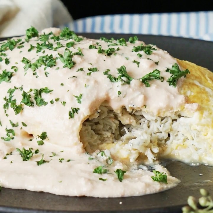 7. 皿に盛り付け、しらすオムレツの上から明太子クリームソースをかけ、パセリを散らし完成!⠀⠀