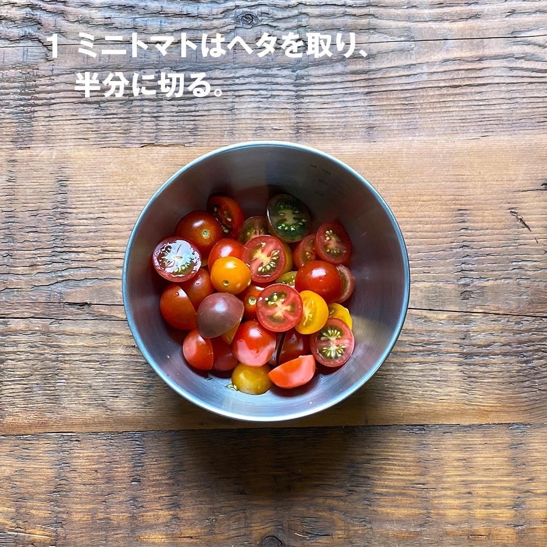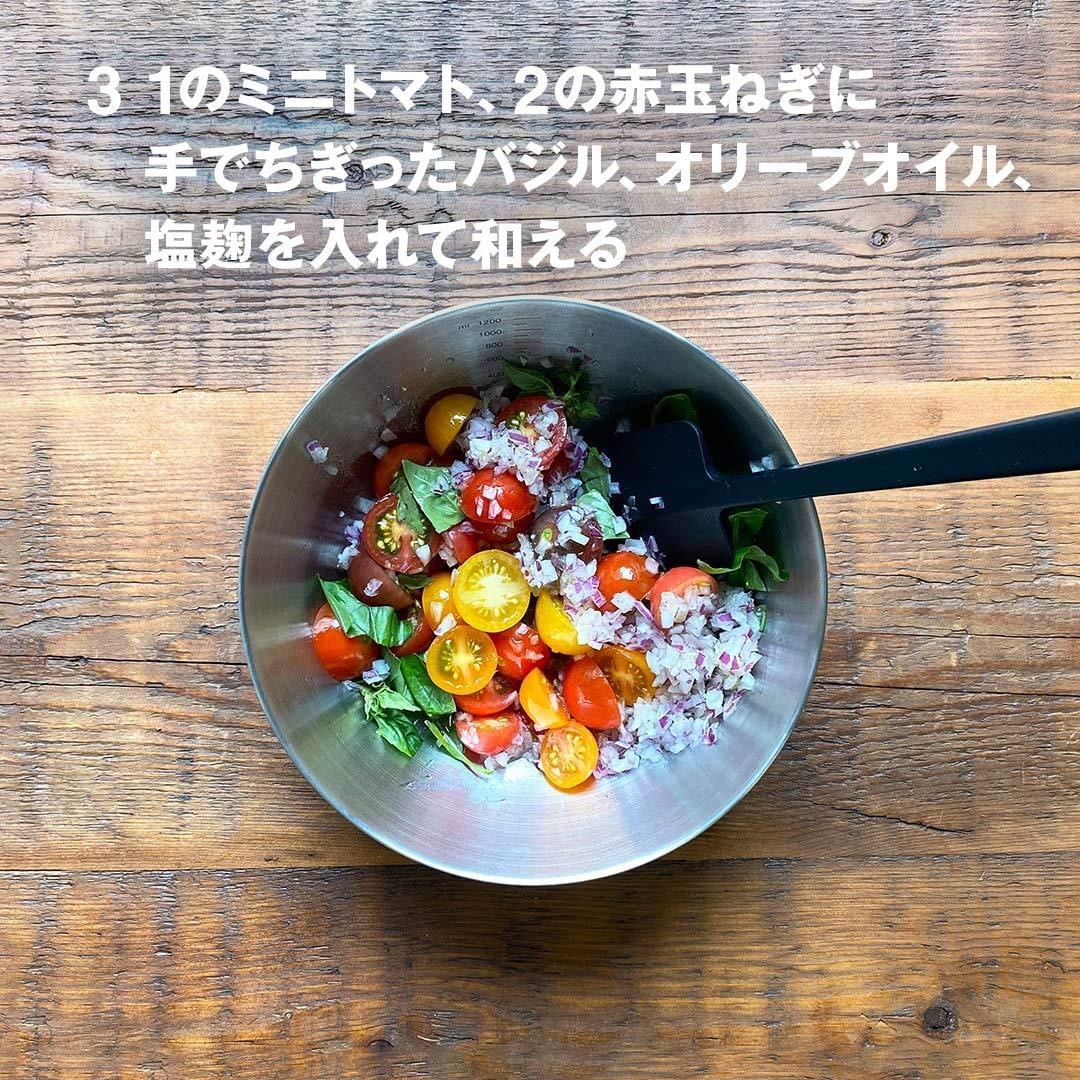 3.(1)のミニトマト、(2)の赤玉ねぎに、手でちぎったバジル、オリーブオイル、塩麹を入れて和える。