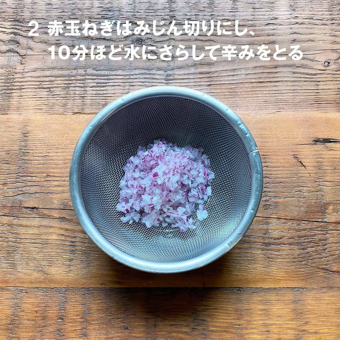 2.赤玉ねぎはみじん切りにし、10分ほど水にさらして辛みをとる。