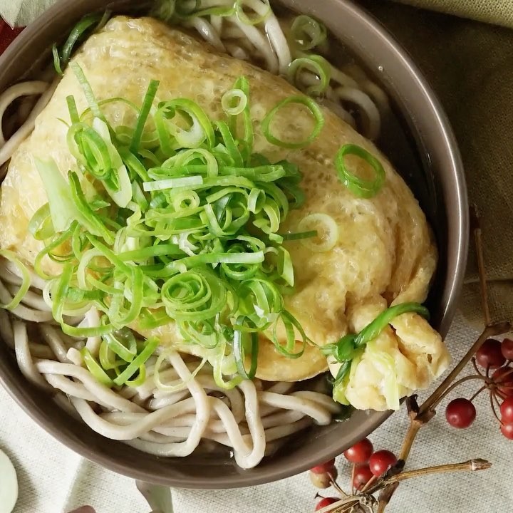 5. お皿にそばと油揚げをうつしてつゆをそそぎ、刻みネギを添える。⠀
