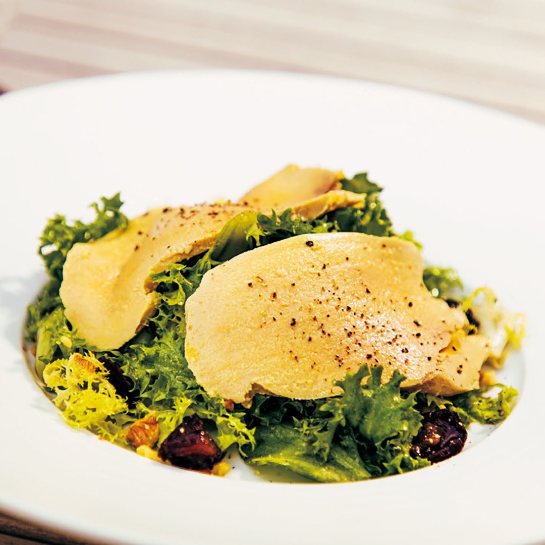 ②セミドライのピオーネやクルミをアクセントにした「フォアグラのサラダ」¥1,650。