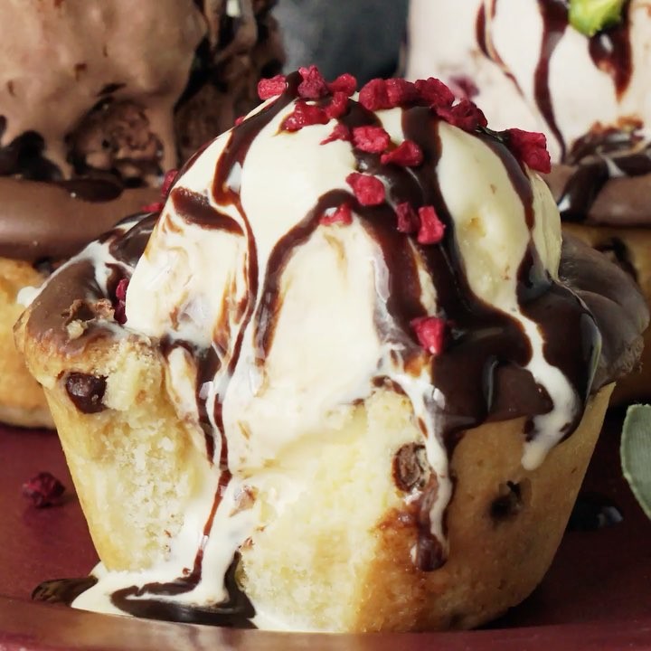 5. 取り出してアイス、チョコソース、トッピングをのせる。⠀