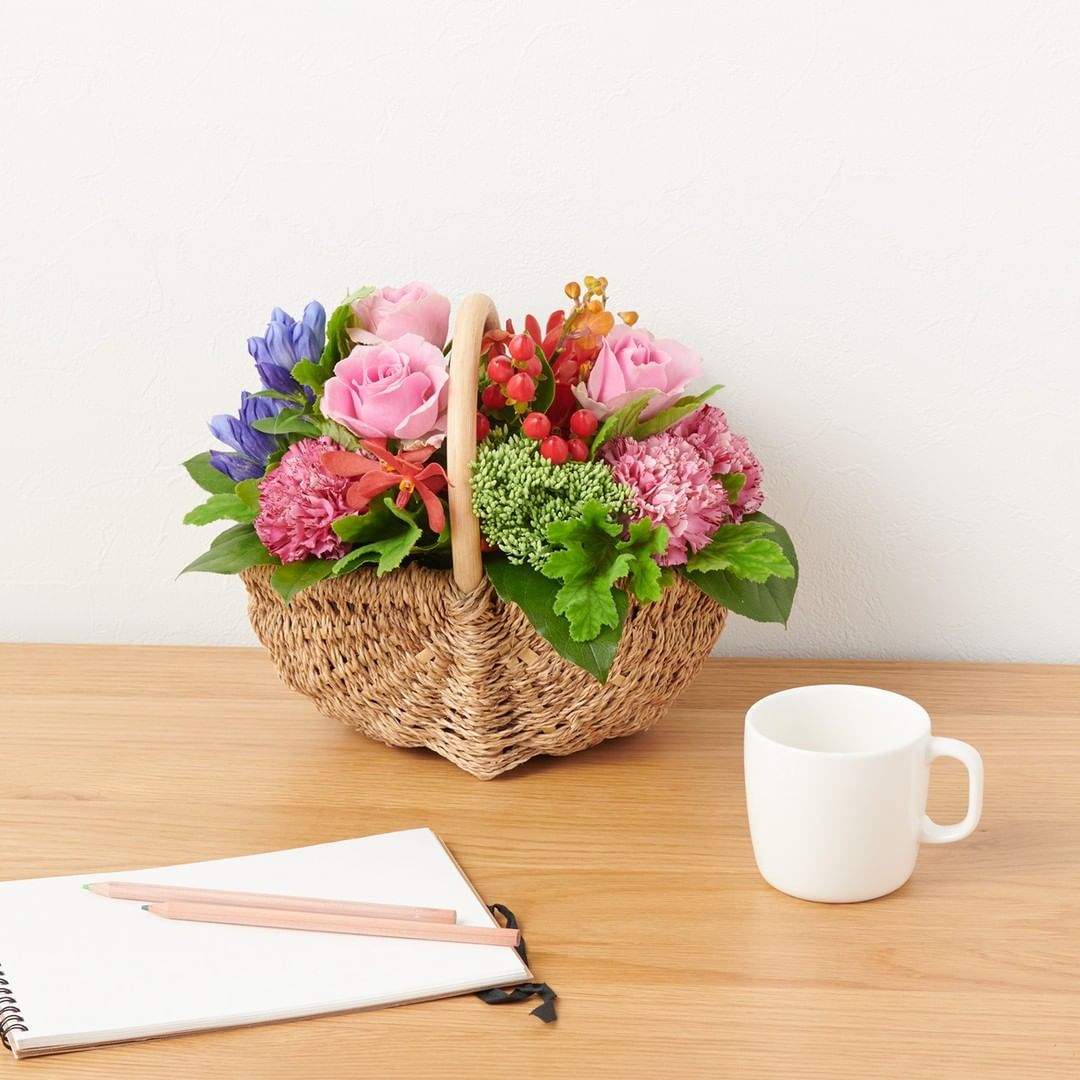#無印良品 #MUJI #花 #flowers #植物 #観葉植物 #花のある暮らし #インテリアグリーン #敬老の日 #ギフト #gift #贈り物 #秋の花 #アレンジメント #バラ #リンドウ #カーネーション #ピンポンマム #ヒペリカム #モミジ #松ぼっくり