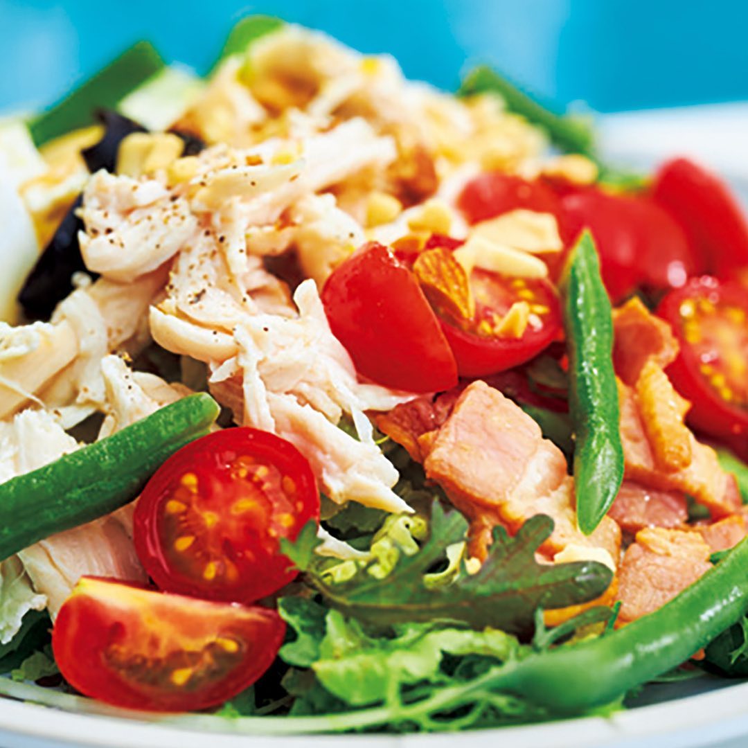 ②糖度の高い和歌山産ミニトマトをふんだんに使用した「LAND特製コブサラダ」。