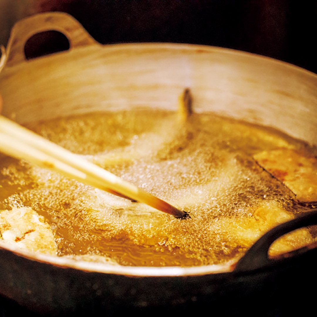 ③ネタの個体差を見極め衣の量や粉をつける部位を変えている。揚げ油はサラダ油とゴマ油を8:2でブレンド。季節によって割合を調整し、現代人好みのライトな口当たりに仕上げる