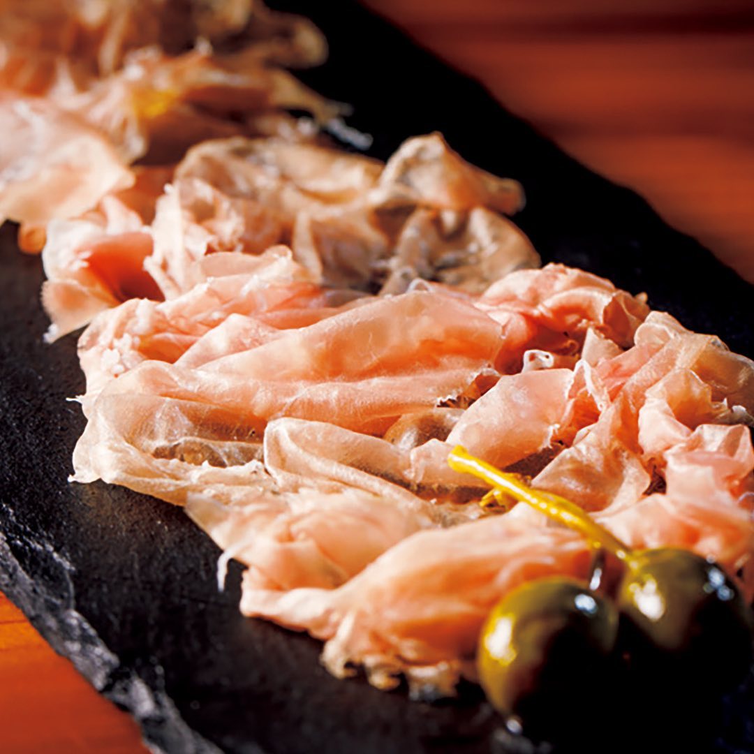 ②「24ヶ月熟成パルマ産プロシュート」。イタリアのBerkel社製のスライサーで極薄にスライスし、淡雪のような口溶け