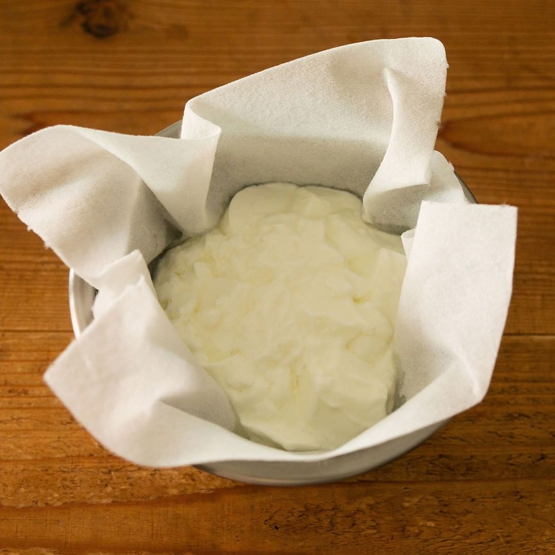 1.ヨーグルトはキッチンペーパーをのせたザルに入れて、冷蔵庫で一晩置きます。