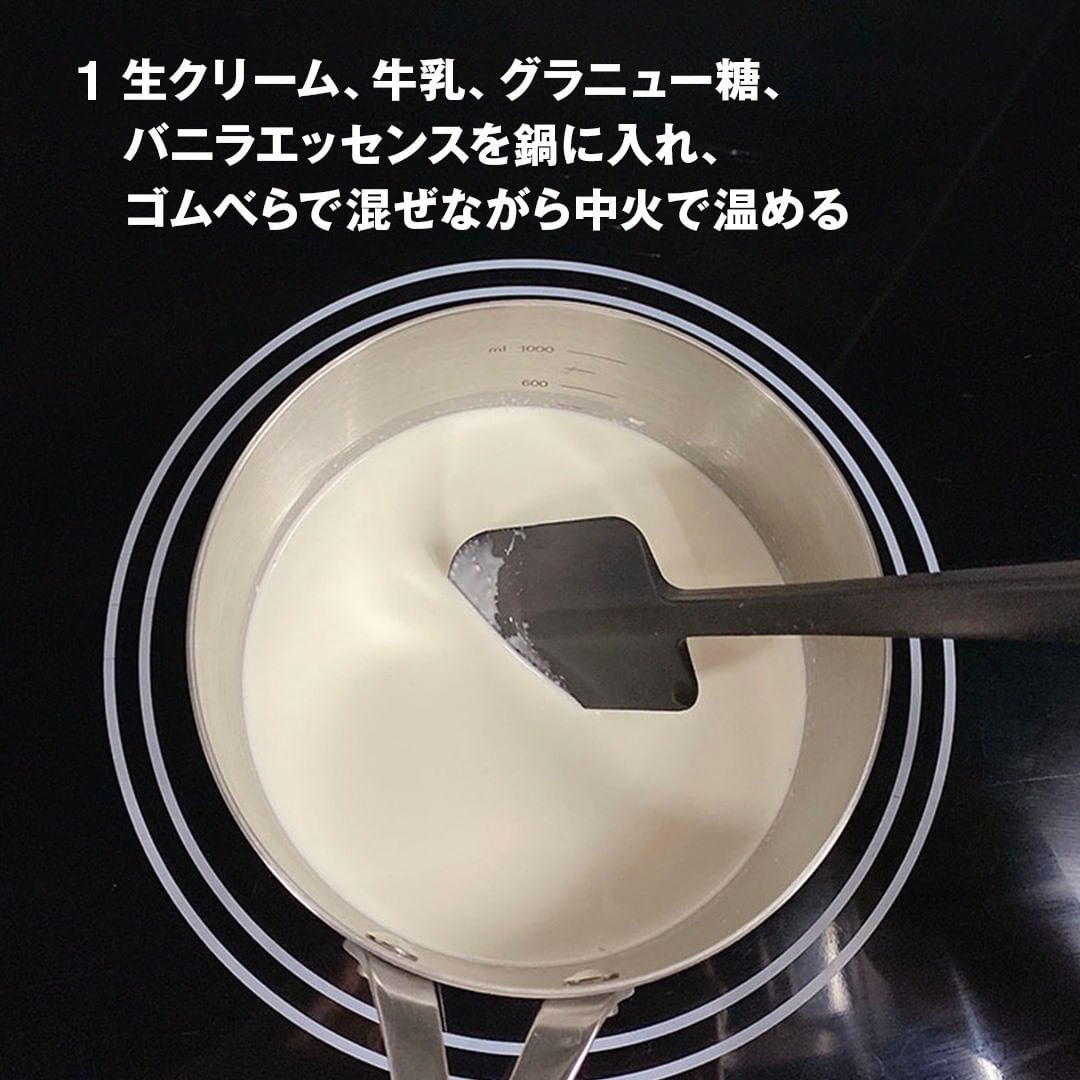 1.生クリーム、牛乳、グラニュー糖、バニラエッセンスを鍋に入れ、ゴムべらで混ぜながら中火で温める。