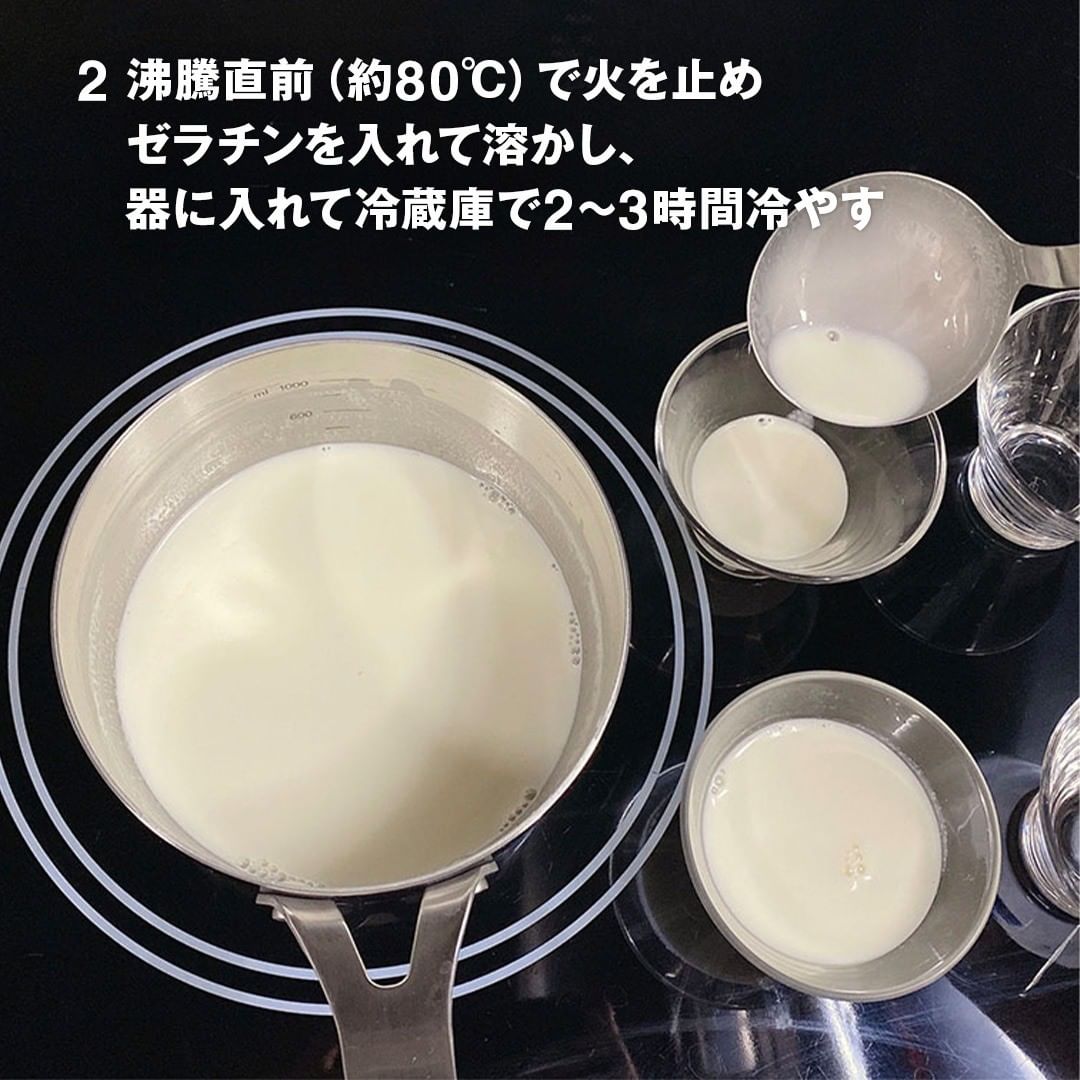 2.沸騰直前(約80℃)で火を止めゼラチンを入れて溶かし、器に入れて冷蔵庫で2~3時間冷やす。