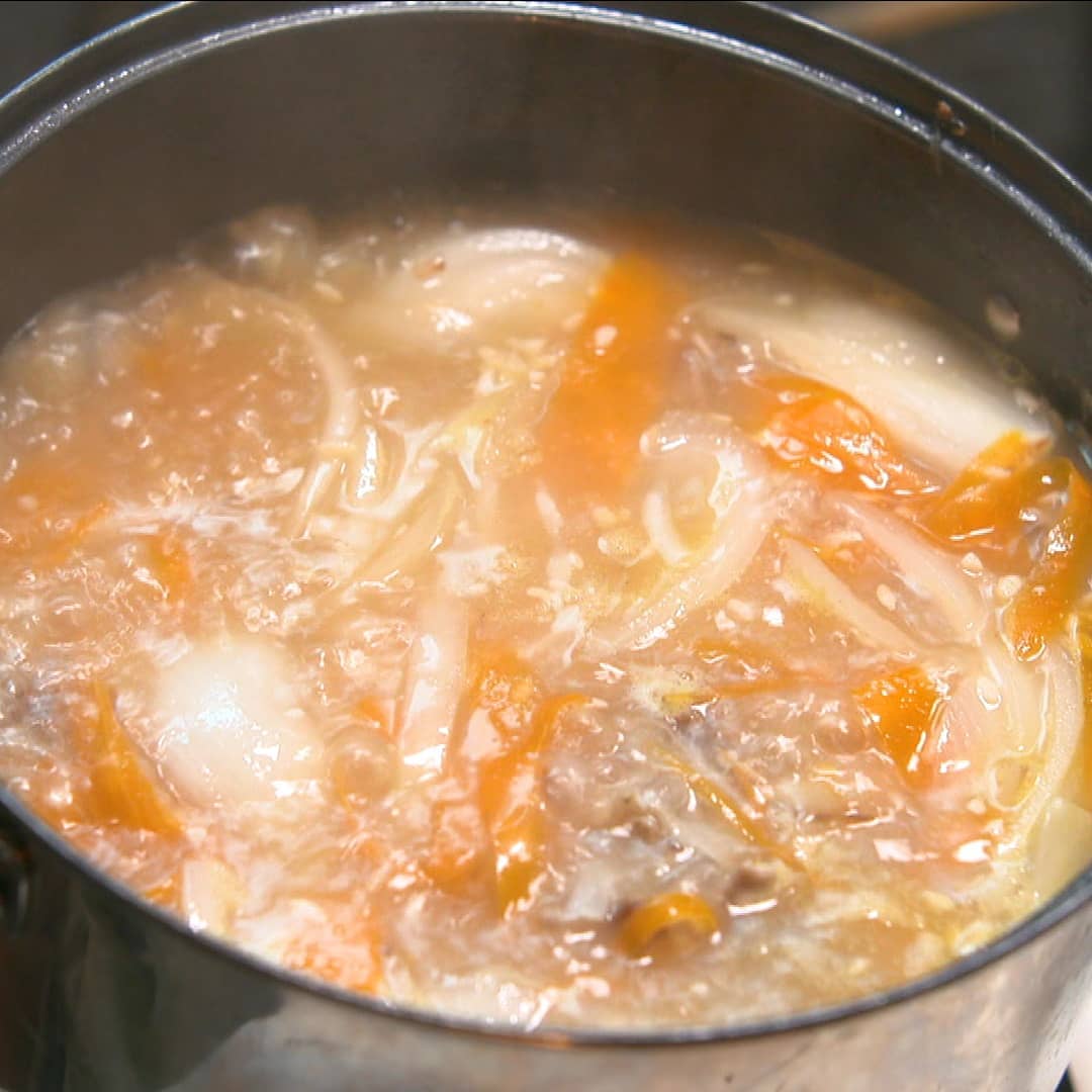 ③ジャガイモを加えて炒め、水を入れて煮込む