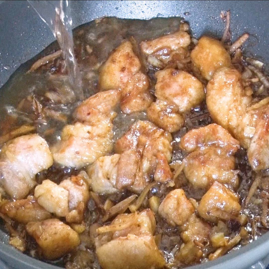 ④オイスターソース(大さじ1)、ごま油(小さじ1)、米酒(大さじ3)、しょう油(大さじ2)塩コショウ、黒糖(大さじ1)、五香粉(少々)、水(50ml)を入れ、落し蓋をして30分煮込む