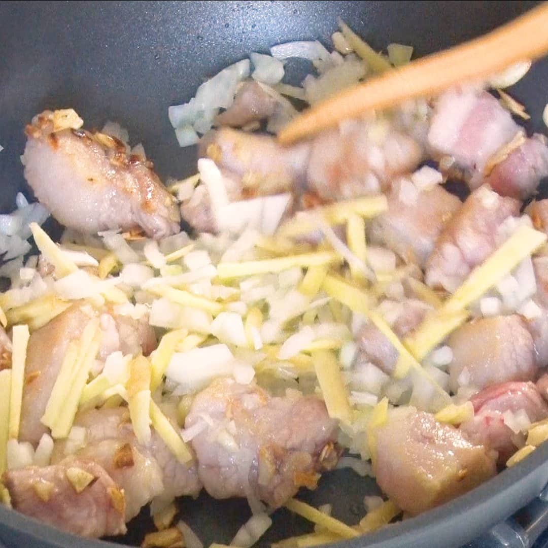 ③ごま油で豚バラ・玉ねぎ・しょうが・にんにくを炒める