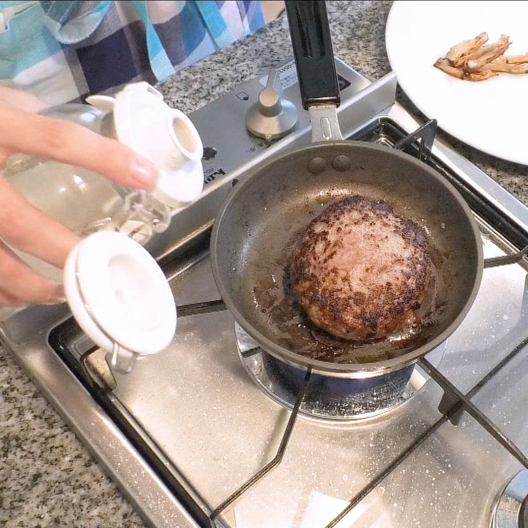 ⑦ハンバーグを焼いたフライパンにポン酢(30ml)バター(20g)水10mlを入れてソースを作れば完成!