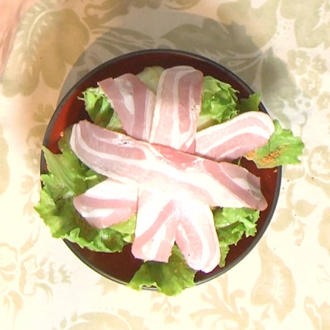 ③レタスを逆さまに器にのせ、その上にベーコン4枚を放射状に並べる