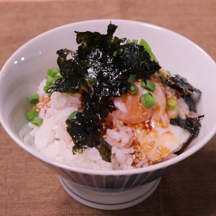 5. ごはんをよそったお茶碗に4を割り入れ、、3をかけて2を散らして完成です。