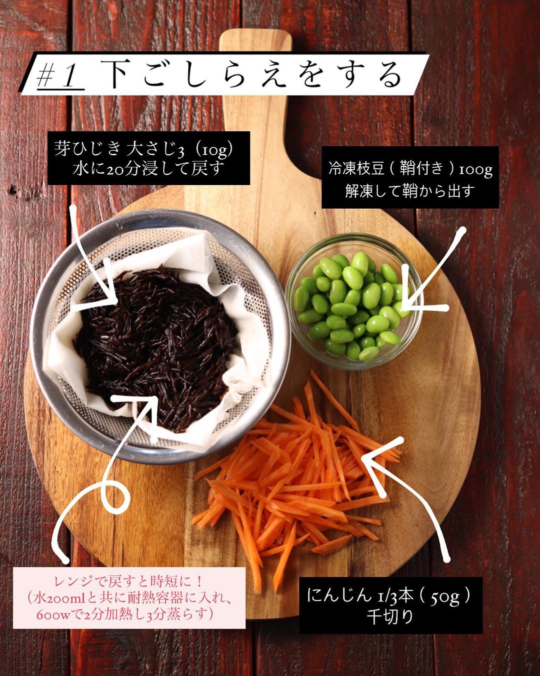 ❶乾燥芽ひじきは、たっぷりの水に20分ほど浸して戻す。にんじんは千切りに、冷凍枝豆は解凍して鞘から出す。