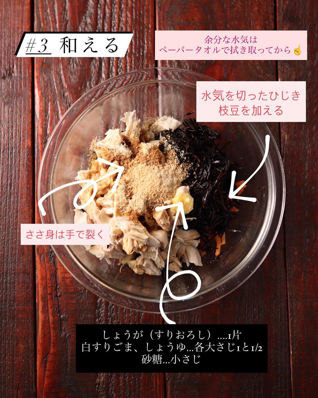 ❸耐熱容器内の余分な水気は、ペーパータオルなどで拭き取る。鶏ささ身を手で裂き、水気を切った芽ひじき・枝豆・【B】を入れて混ぜ合わせる。時間があれば、冷やして食べるとさらに美味しい!