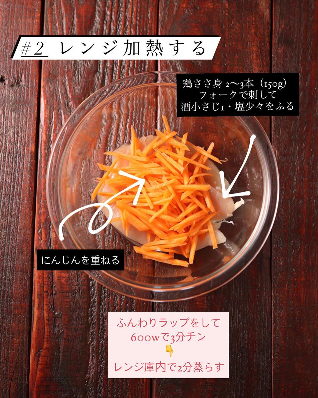 ❷耐熱容器に鶏ささ身を入れてフォークで数カ所穴をあけ、【A】をふる。上ににんじんを重ねてふんわりラップをし、電子レンジ(600w)で3分ほど加熱する。そのままレンジの庫内で2分置いて蒸らす。