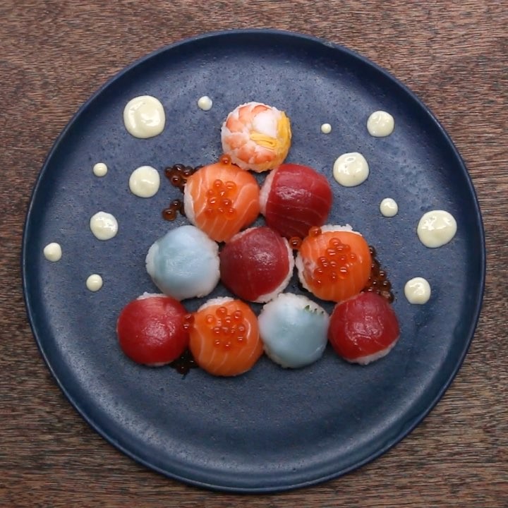9.皿に手まり寿司をバランスよく並べ、雪に見立てたわさびマヨを絞ったら、完成!