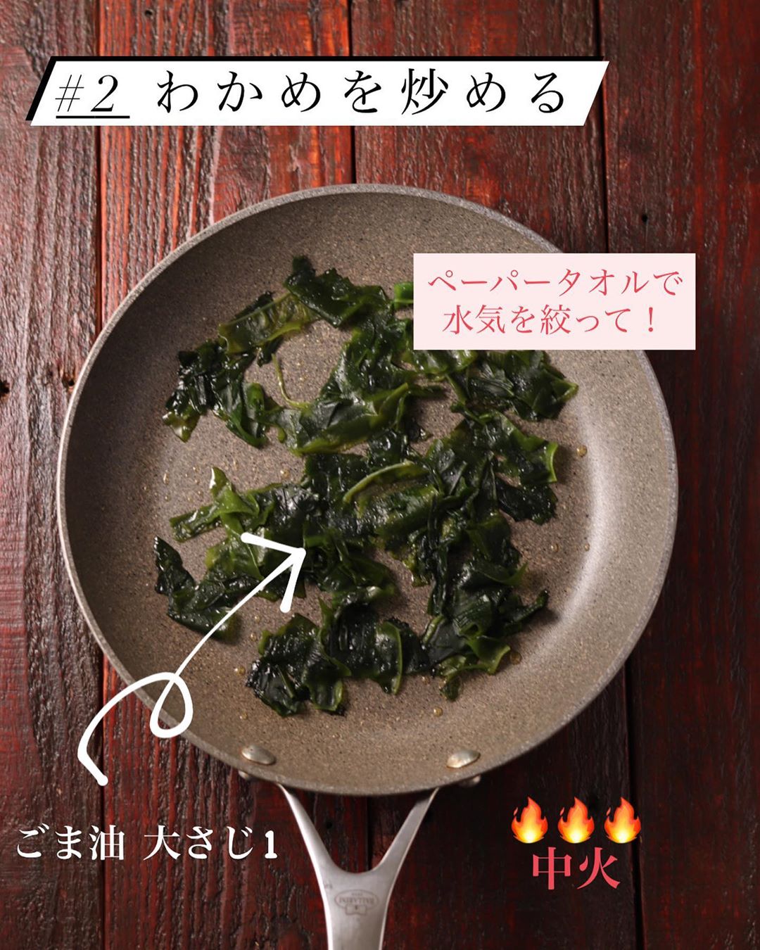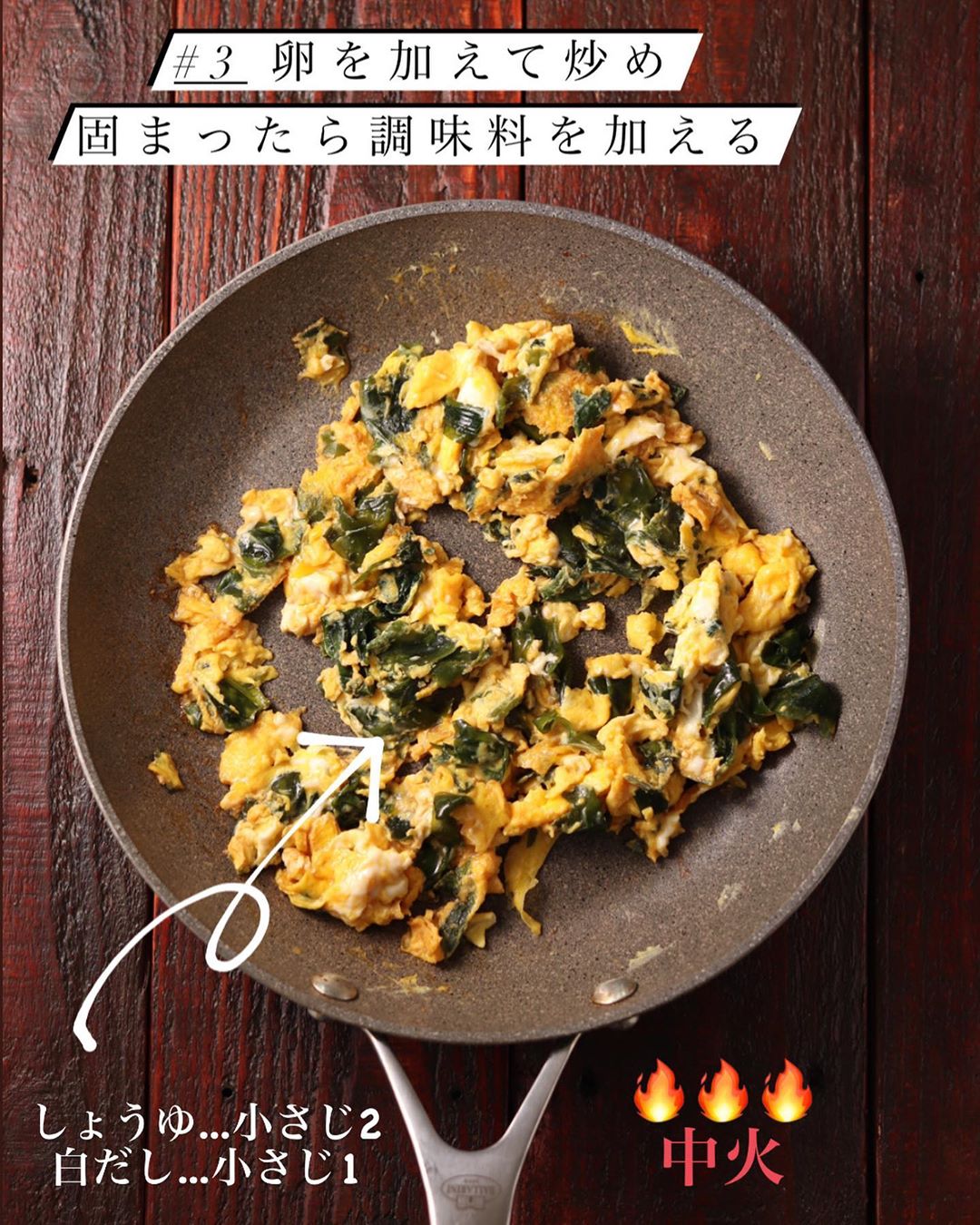 ❷フライパンにごま油を中火で熱し、わかめを加えてサッと炒める。全体に油が回ったら、卵を加えてさらに炒める。卵が固まったら【A】を加えて全体に絡める。