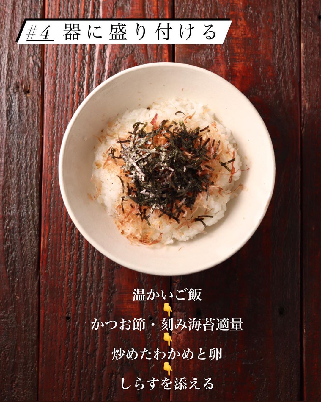 ❸器に温かいご飯を盛り、かつお節・刻み海苔を広げる。2・しらすを乗せて完成!あれば、刻みネギや、青じその千切りを添えると彩りもバッチリ!