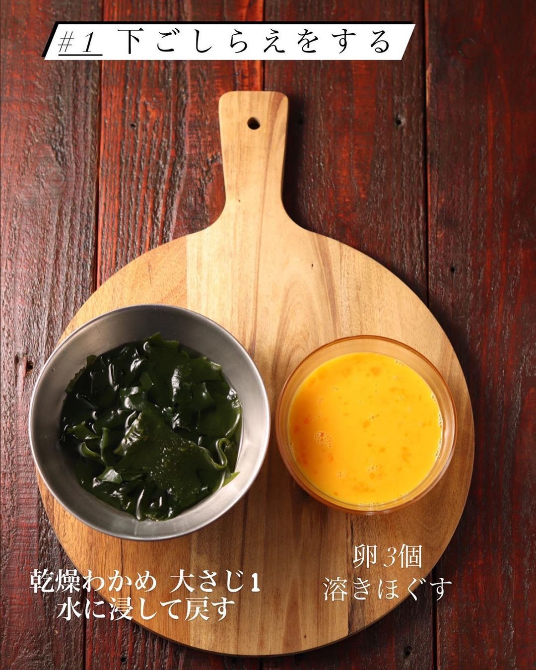 ❶乾燥わかめは水に5分ほどひたして戻し、ザルにあげて水気を切り、ペーパータオルで軽く絞る。卵は溶いておく。