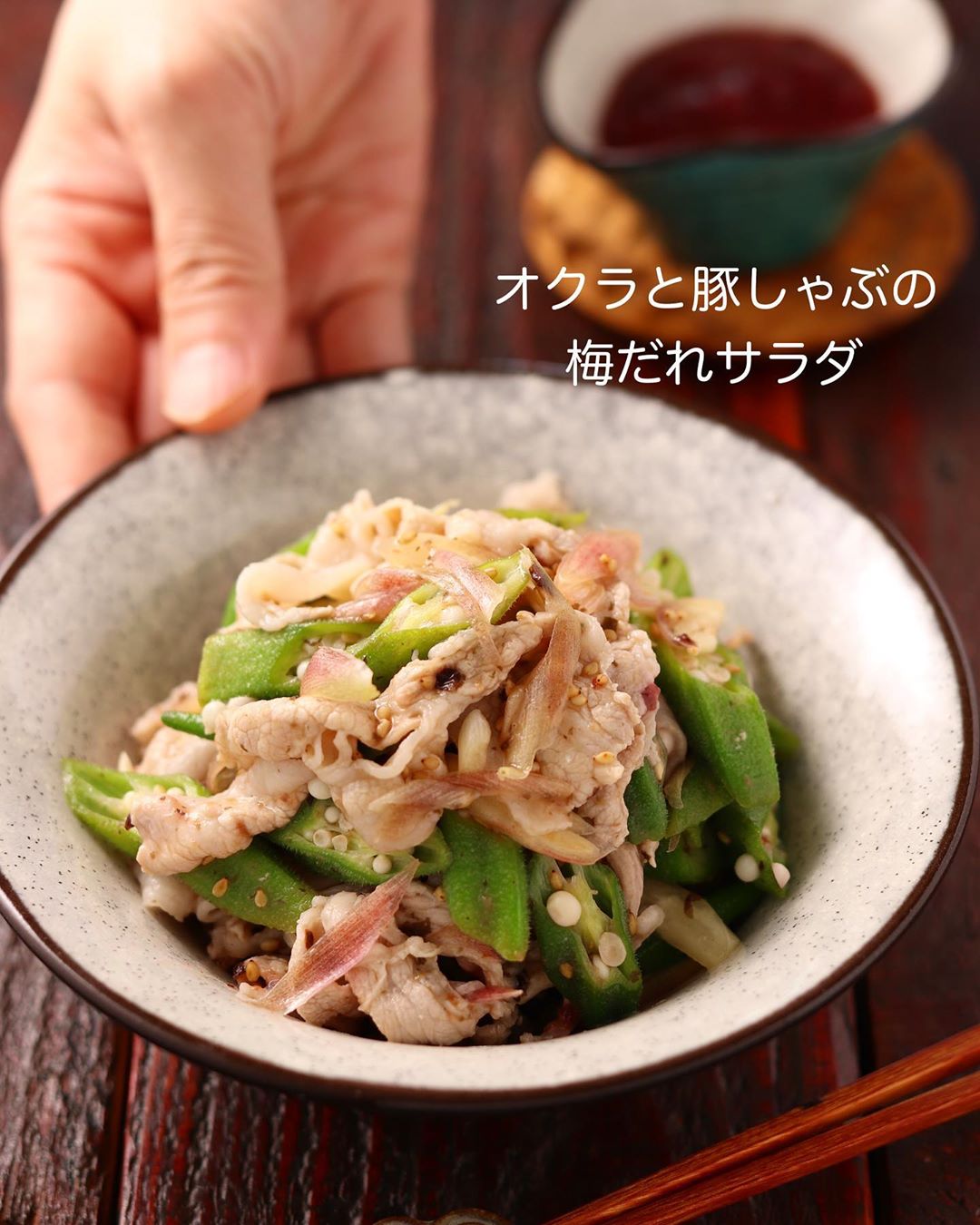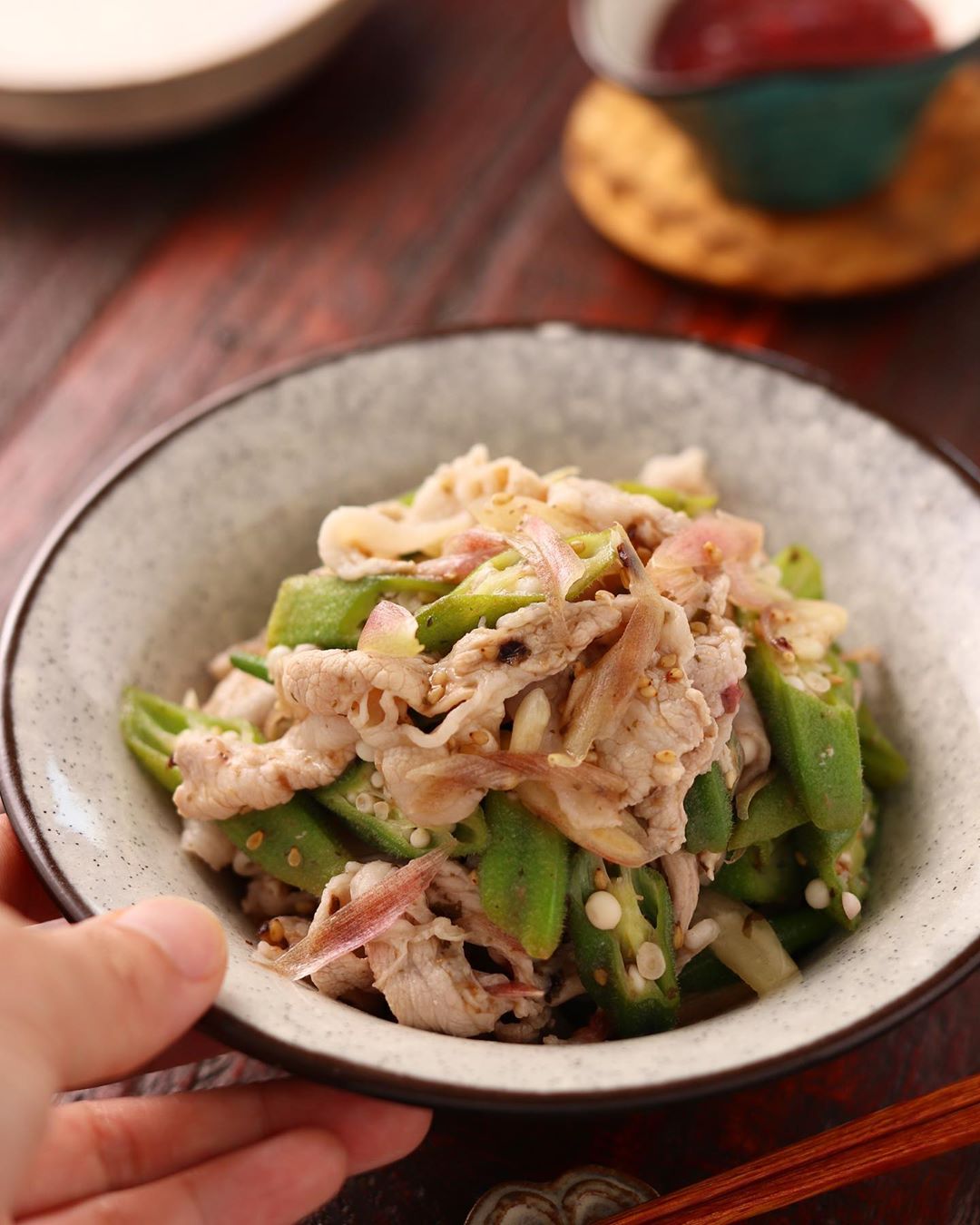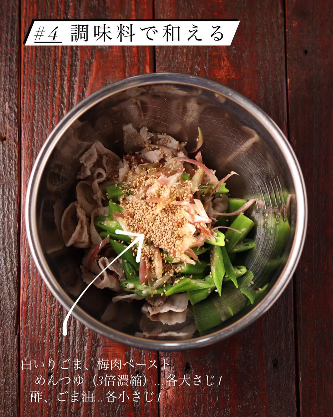❸ボウルに豚肉・オクラ・みょうが・【A】を入れて、混ぜ合わせる。