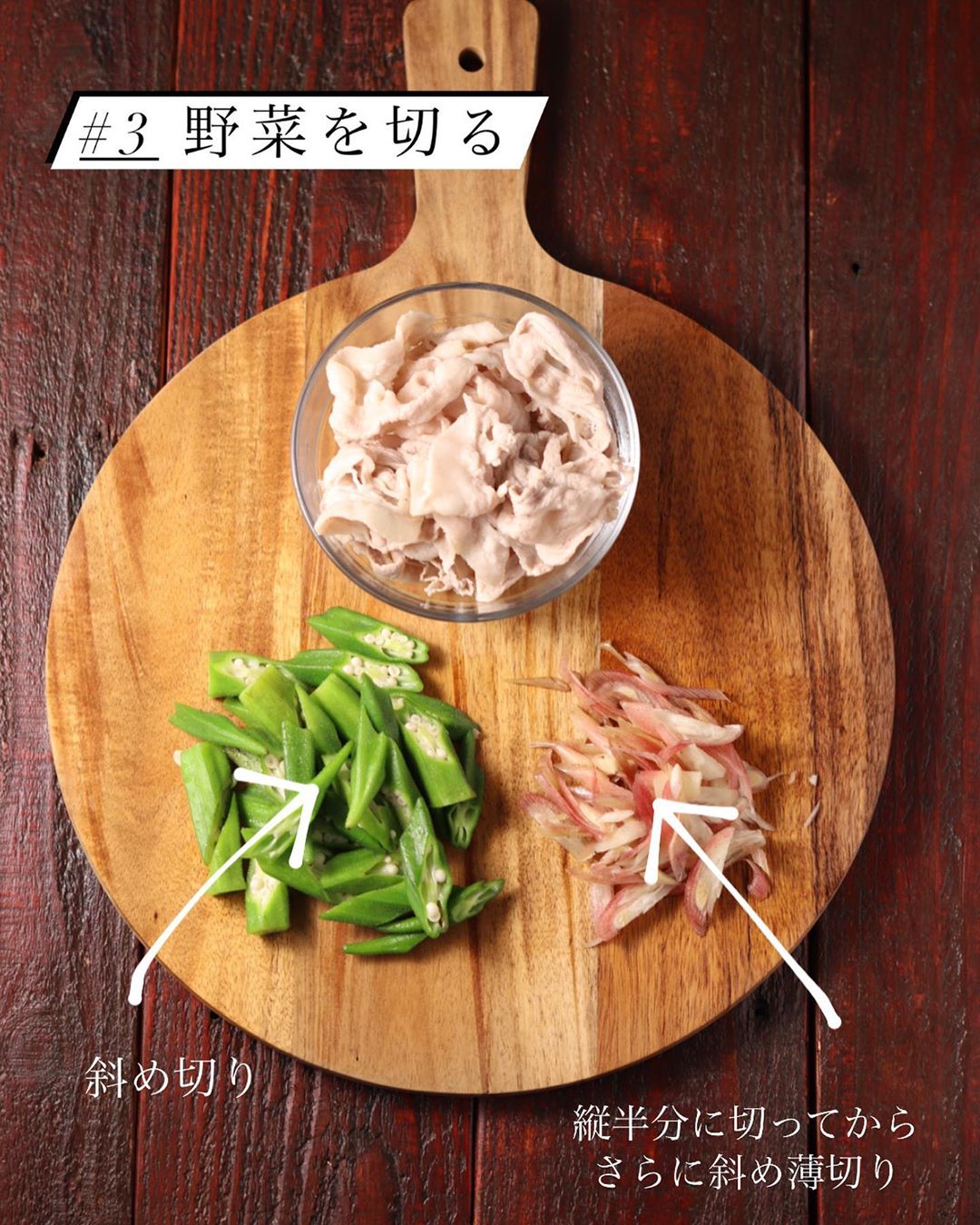 ❷オクラはガクを取り、斜め切りにする。みょうがは縦半分に切ってから、さらに斜め薄切りにする。