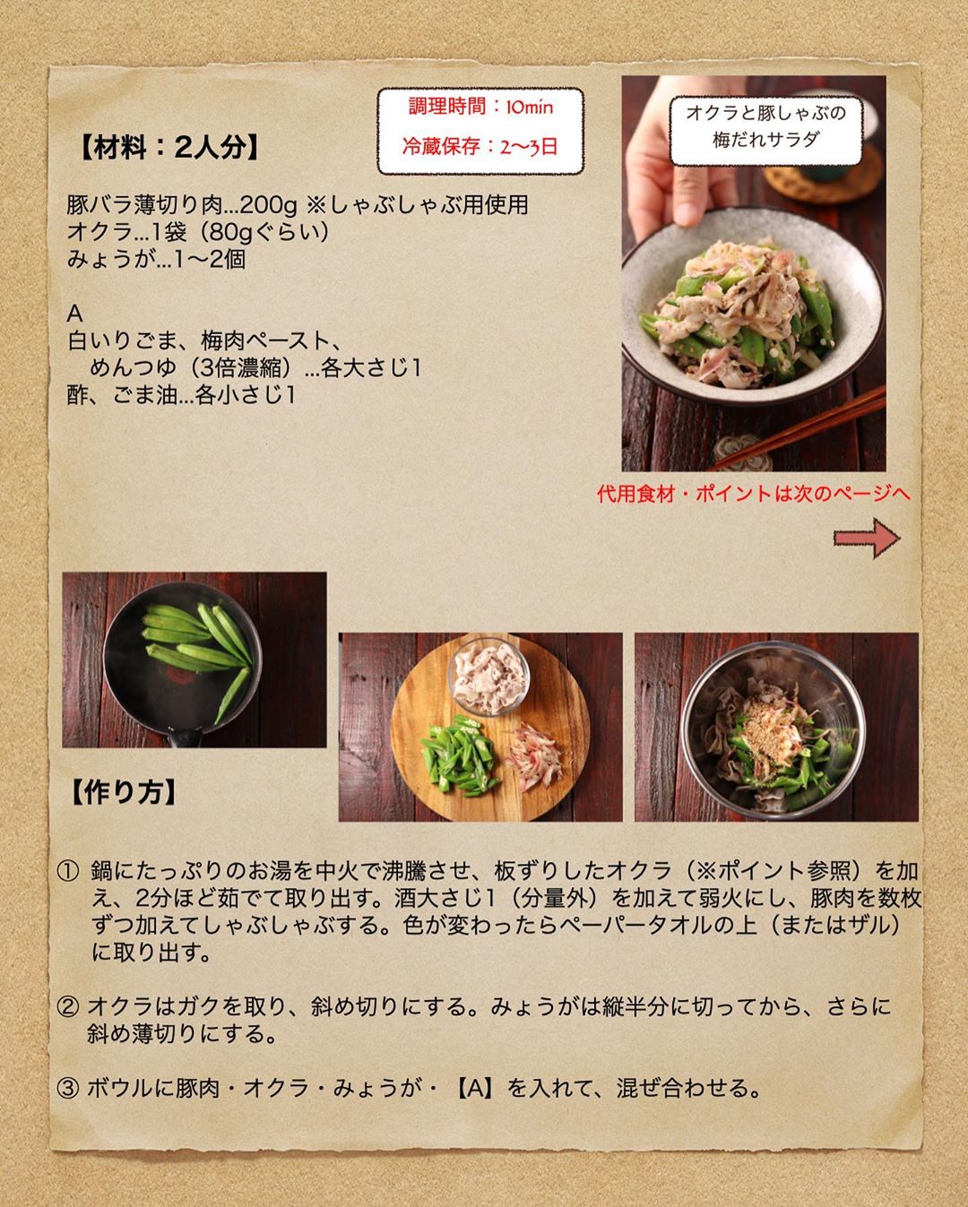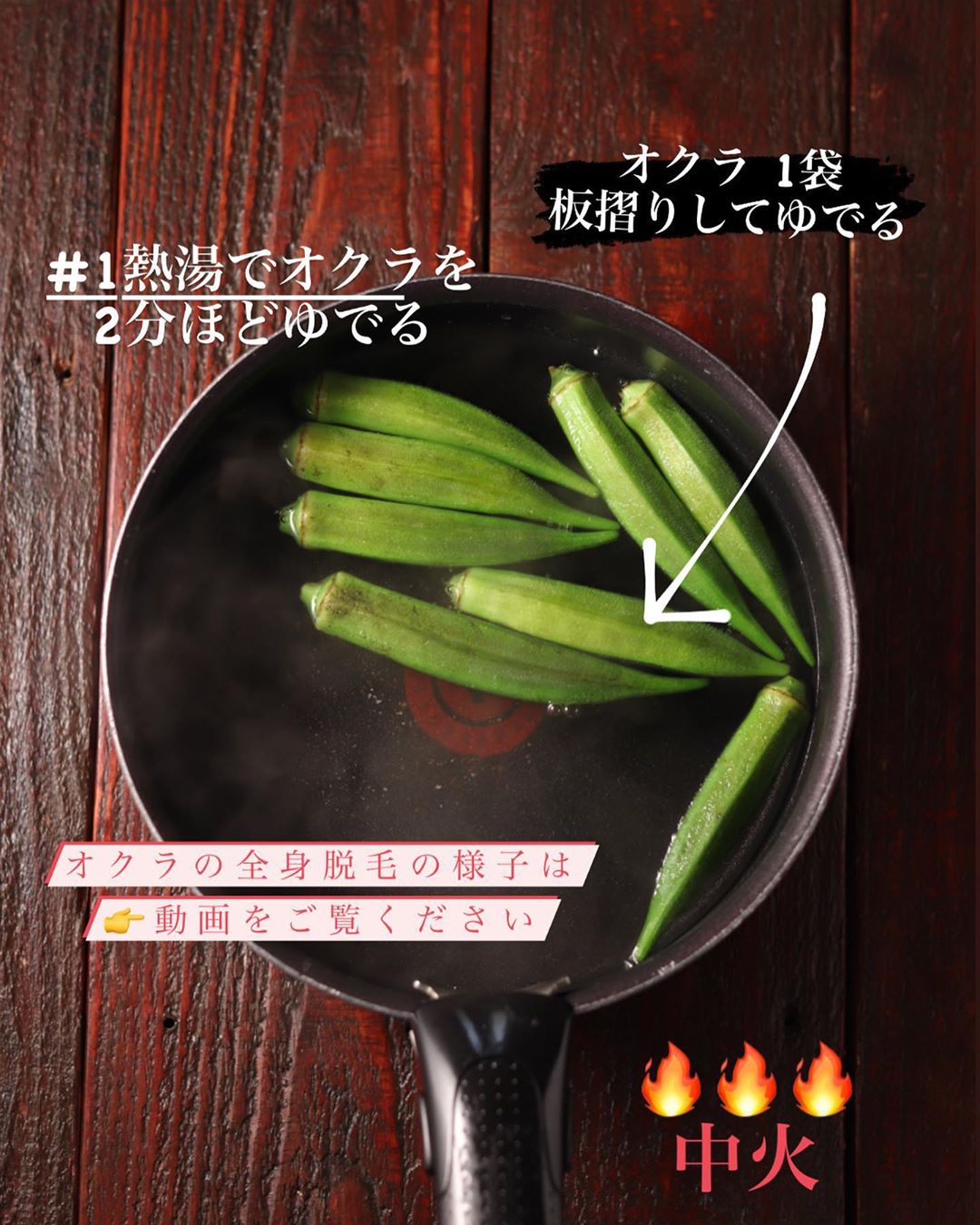 ❶鍋にたっぷりのお湯を中火で沸騰させ、板ずりしたオクラ(※ポイント参照)を加え、2分ほど茹でて取り出す。酒大さじ1(分量外)を加えて弱火にし、豚肉を数枚ずつ加えてしゃぶしゃぶする。色が変わったらペーパータオルの上(またはザル)に取り出す。