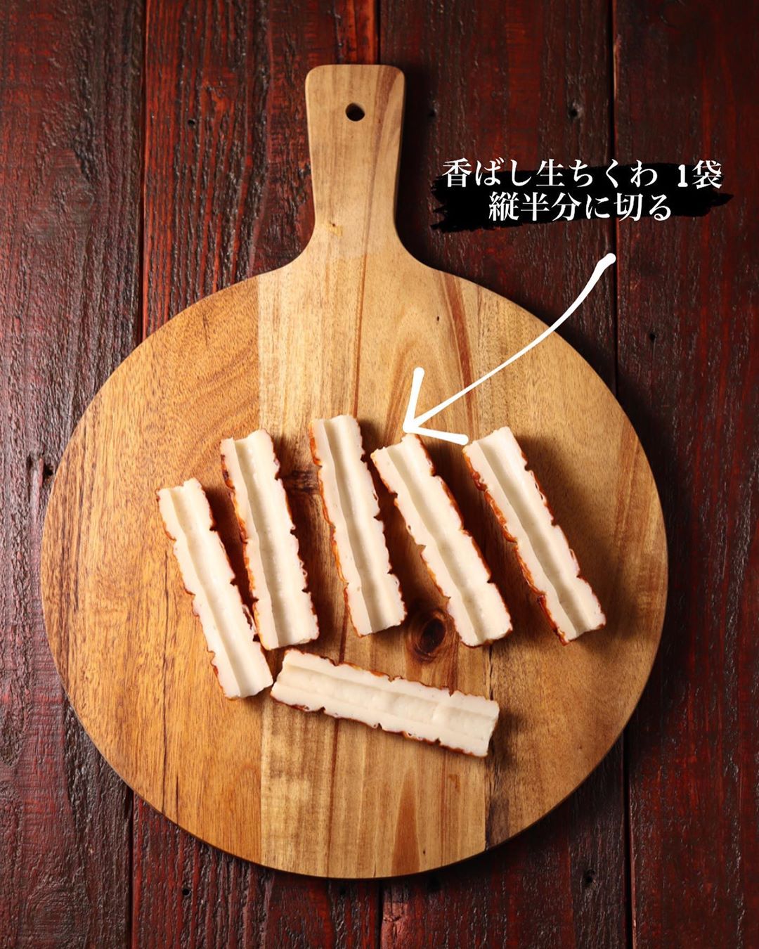 ❶香ばし生ちくわは、縦半分に切る。