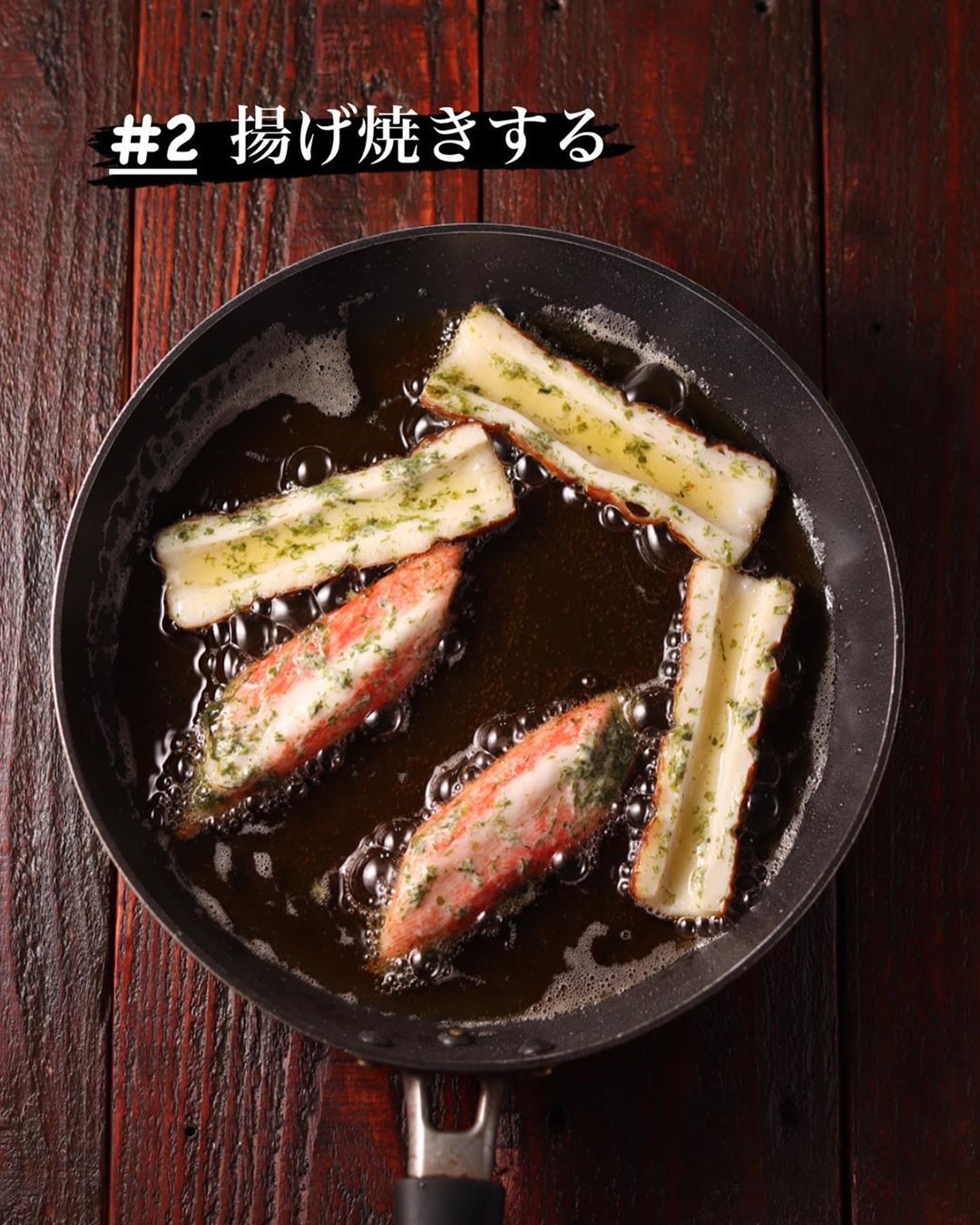❸フライパンに深さ1cmの揚げ油を中火で熱し、2を入れる。全体が色づいたら取り出して油を切る。